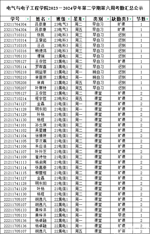 第六周早晚自习缺勤及课堂出勤情况如下: