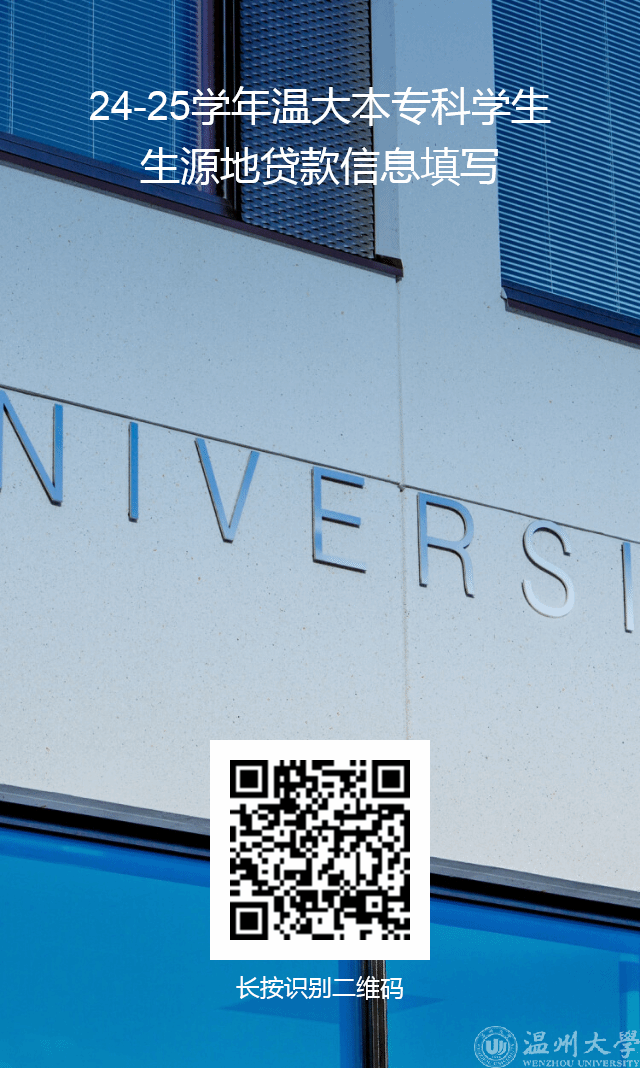 根据国家开发银行生源地信用助学贷款手续办理的要求,员工在生源地办理完信用助学贷款后,需要高校在限定时间内进行网上回执录入,请办理国开行生源地贷款的新老生,务必在9月20日前扫描下方二维码完成《24-25学年温大本专科员工生源地贷款信息填写》,否则影响本人助学贷款发放。