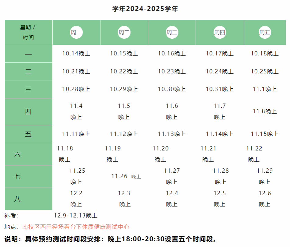1、 员工体质健康测试中心在南校区西田径场看台下,请大家测试时前往南校区体测中心!