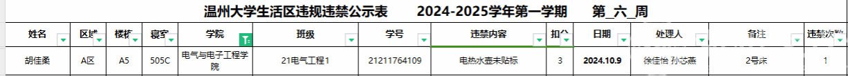 自2024-2025学年第一学期入学开始,学校针对宿舍安全进行大排查。根据学校第六周寝室安全卫生检查结果,第六周排查到1位同学存在寝室违规现象,受到学校通报;现根据学校相关规定,对上述同学进行院内通报批评,请其他同学引以为戒(名单见下)