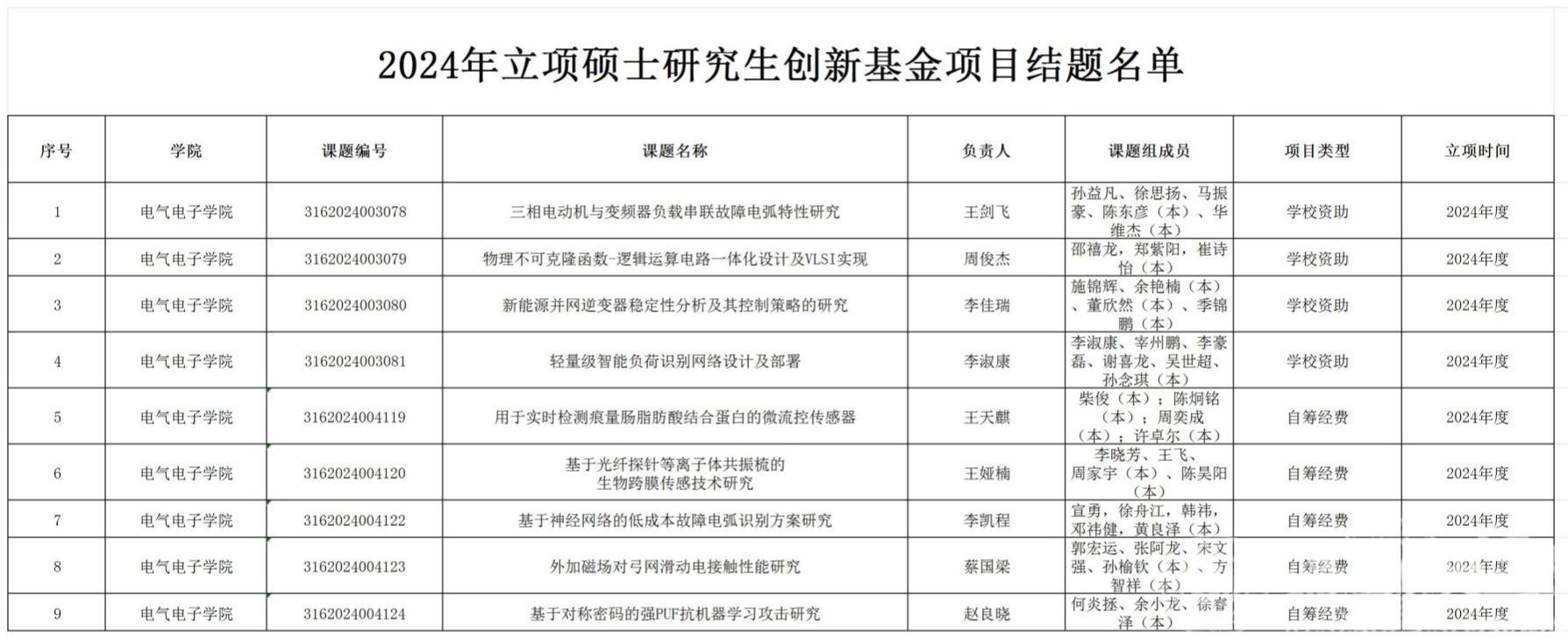 根据《3044永利集团硕士研究生创新基金管理办法(2020年修订)》要求,经项目负责人申报、学院研究生工作委员会评审,拟同意《三相电动机与变频器负载串联故障电弧特性研究》等九个项目结题。现将拟结题名单公示如下,公示期从即日起至3月2日,如果有问题,请联系林老师86689117。
