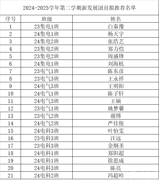 根据《中国共产主义青年团章程》《关于做好2024-2025学年第二学期团员发展与管理工作的通知》等相关要求,经本人自愿申请、团支部推荐,结合在校综合表现,经学院团委评议审核,拟将余炯圣等21名青年员工发展为共青团员。