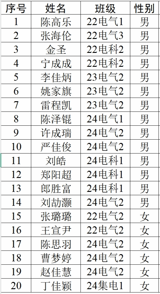 根据《关于2025年“温州宏丰未来之星”项目员工报名选拔的通知》要求,经自主申报、学院评选,拟推荐以下20名同学参加公司“温州宏丰未来之星”之“中国西电、西安交大暑期研学”。