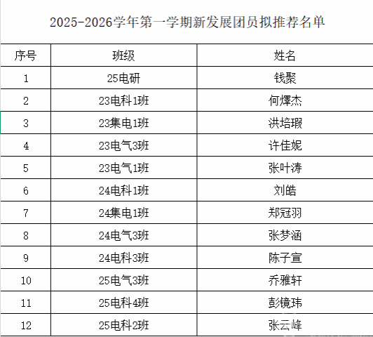 根据《中国共产主义青年团章程》《关于做好2025-2026学年第一学期团员发展与管理工作的通知》等相关要求,经本人自愿申请、团支部推荐,结合在校综合表现,经学院团委评议审核,拟将钱聚等12名青年员工发展为共青团员。
