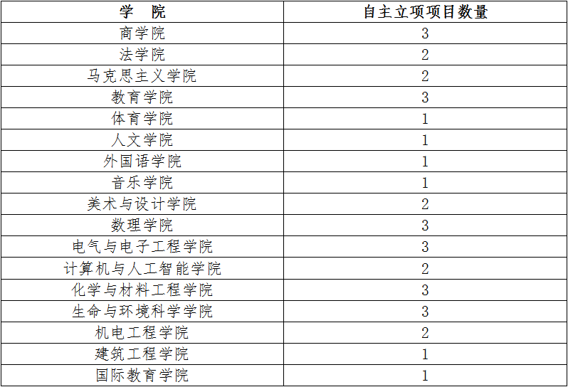 3、综合考虑“挑战杯”历年成绩、学校高峰团队建设,酌情给予各学院不等数量的自主立项项目数量,详见下表。