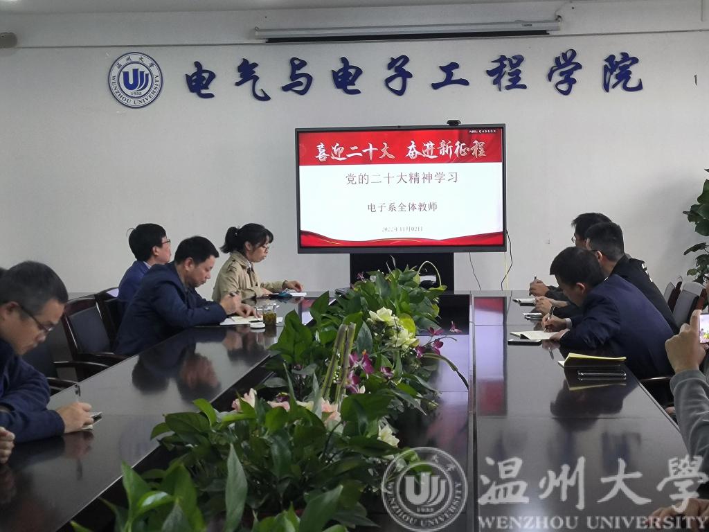 11月2日下午,电子系教工党支部召集电子系全体教师在1A502会议室召开了党的二十大专题学习会。全系教师认真学习了习近平总书记代表第十九届中央委员会在二十大开幕式上作的题为《高举中国特色社会主义伟大旗帜 为全面建设社会主义现代化国家而团结奋斗》的报告。这份报告是党和人民智慧的结晶,是党团结带领全国各族人民夺取中国特色社会主义新胜利的政治宣言和行动纲领,是马克思主义的纲领性文献,这份报告承载着科学谋划未来5年乃至更长时期党和国家事业发展的目标任务和大政方针的历史使命。会上老师们积极发言畅谈学习体会,汪鹏君经理勉励各位老师要将二十大报告的指导精神融入学院的教学与育人工作中,积极推进学院新一轮的发展。全体教师对二十大报告的思想性和先进性作出了高度评价。