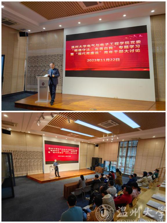 随后,公司党委书记李方强向参会青年教师传达了省、市主题教育办关于“明德守法、完善自我”专项行动工作方案精神,带领大家深入学习了《关于在主题教育中开展青年干部“明德守法、完善自我”专项行动的实施方案》 (浙教办发 [2023] 38 号)等文件精神,并组织青年教师深入学习习近平总书记关于政治品德、职业道德、社会公德、家庭美德等方面的重要论述。他要求全体青年干部要将“明德守法、完善自我”的要求落实在实际工作、日常生活中,要持续加强理论学习,坚守育人初心,不断提高政治站位,树立正确的法治观和道德观,增强廉洁自律意识,提升履职能力本领,以榜样的精神起好标杆作用。