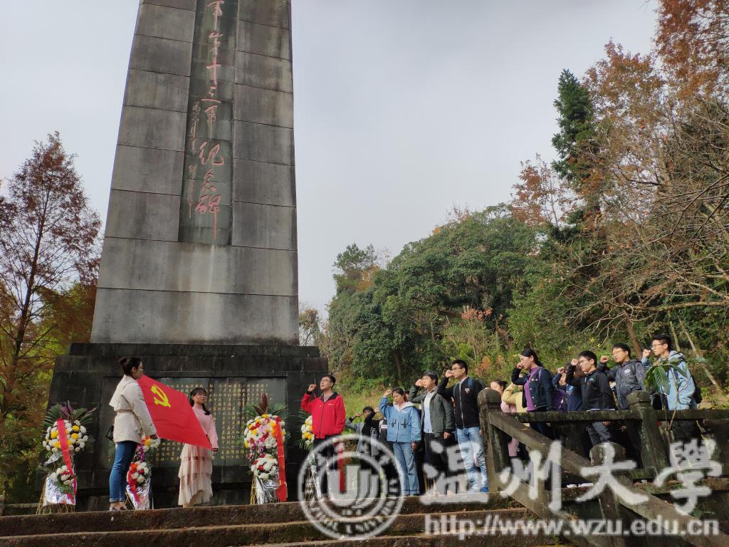 首先,在“中国工农红军第十三军纪念碑”前,研究生第三党支部书记周新城开展“书记党课”,为党员们介绍了红十三军的诞生、战绩、结局以及革命精神,带党员们回顾了那段历史。怀着对红十三军的敬仰,党员们登上台阶,瞻仰革命烈士纪念碑,并进行了新发展党员的入党宣誓,老党员重温入党誓词。