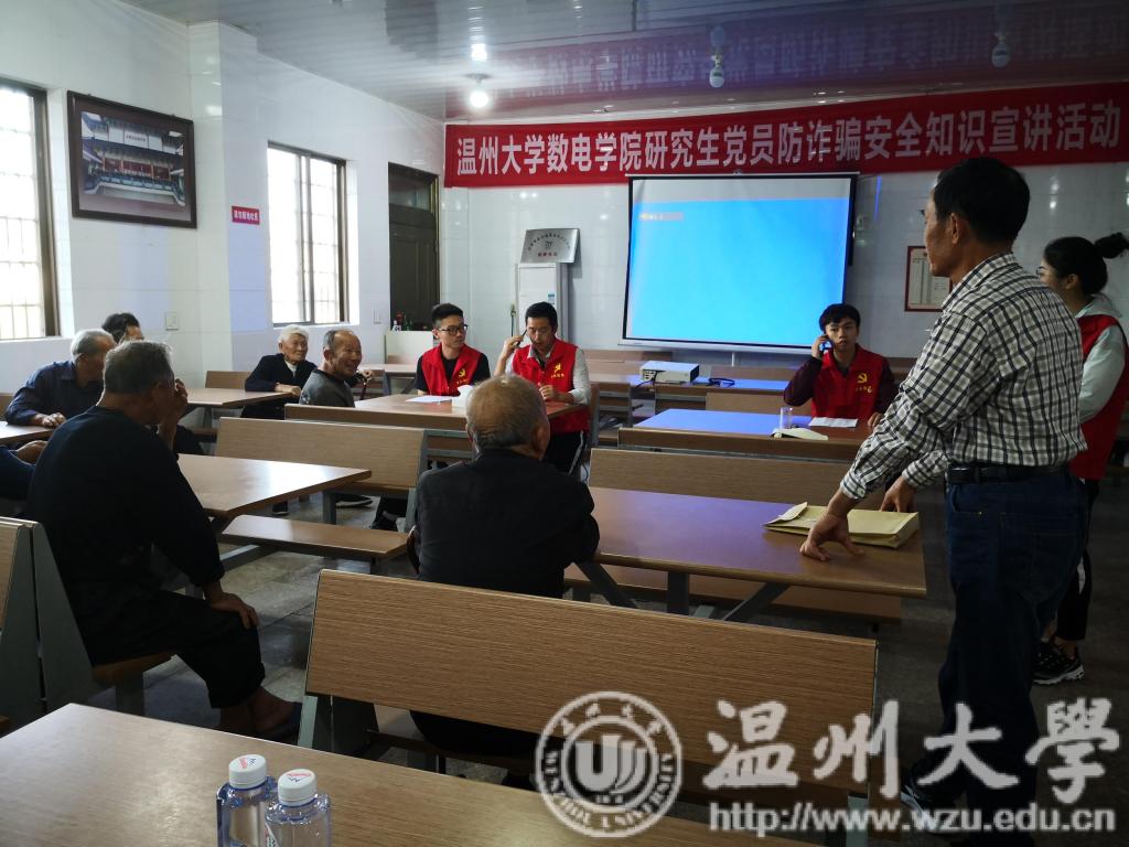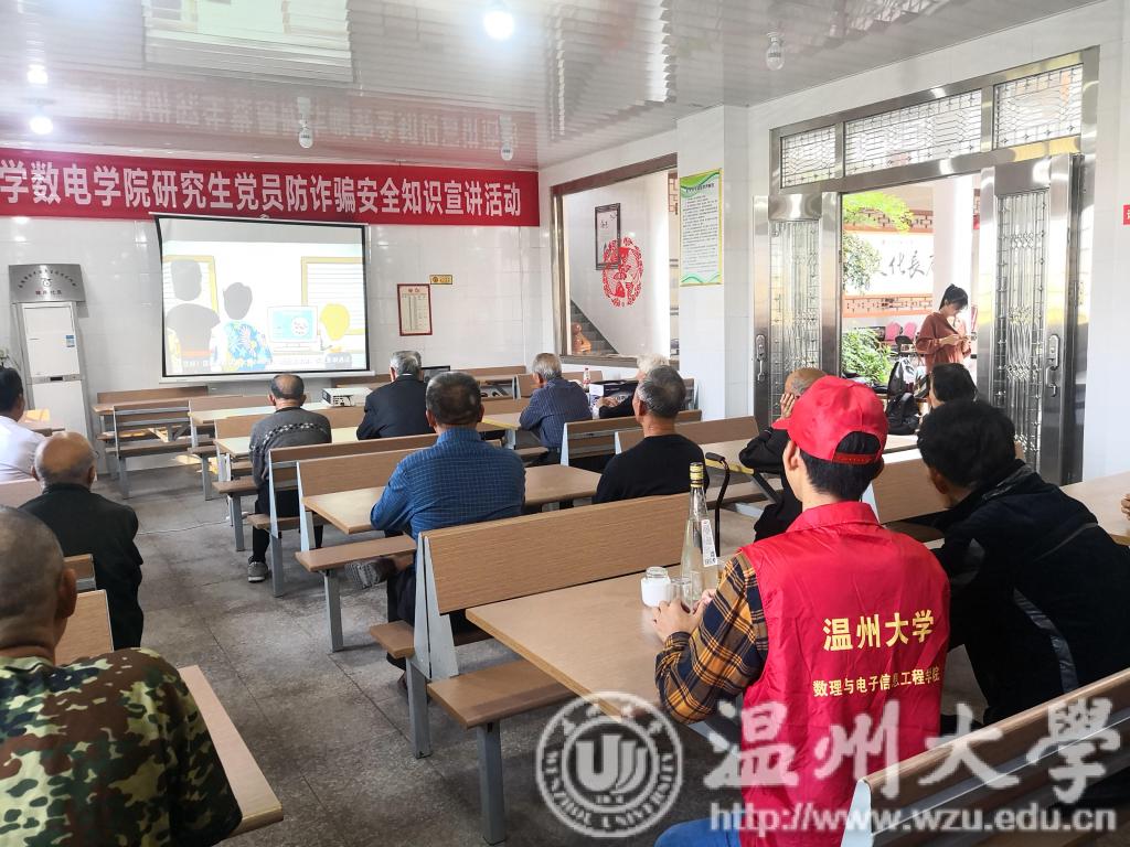 11月7日,3044永利集团数理与电子信息工程学院研究生党员借新青年下乡的契机,走进乐清翁垟街道开展党日活动,聆听了翁垟街道离退休干部支部书记题为“学习党的历史,传承红色基因”的党课,并为离退休支部老党员和当地群众做了防诈骗安全知识宣传。